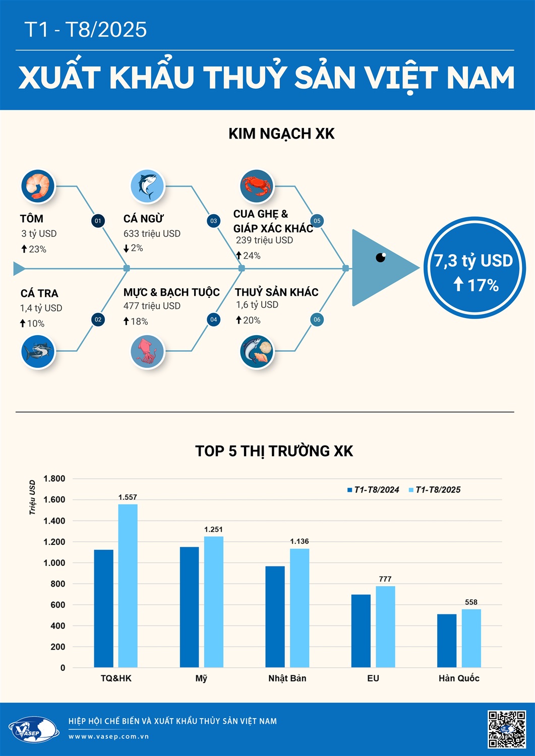 Infographic: Xuất khẩu Thuỷ sản của Việt Nam 8 tháng đầu năm 2025